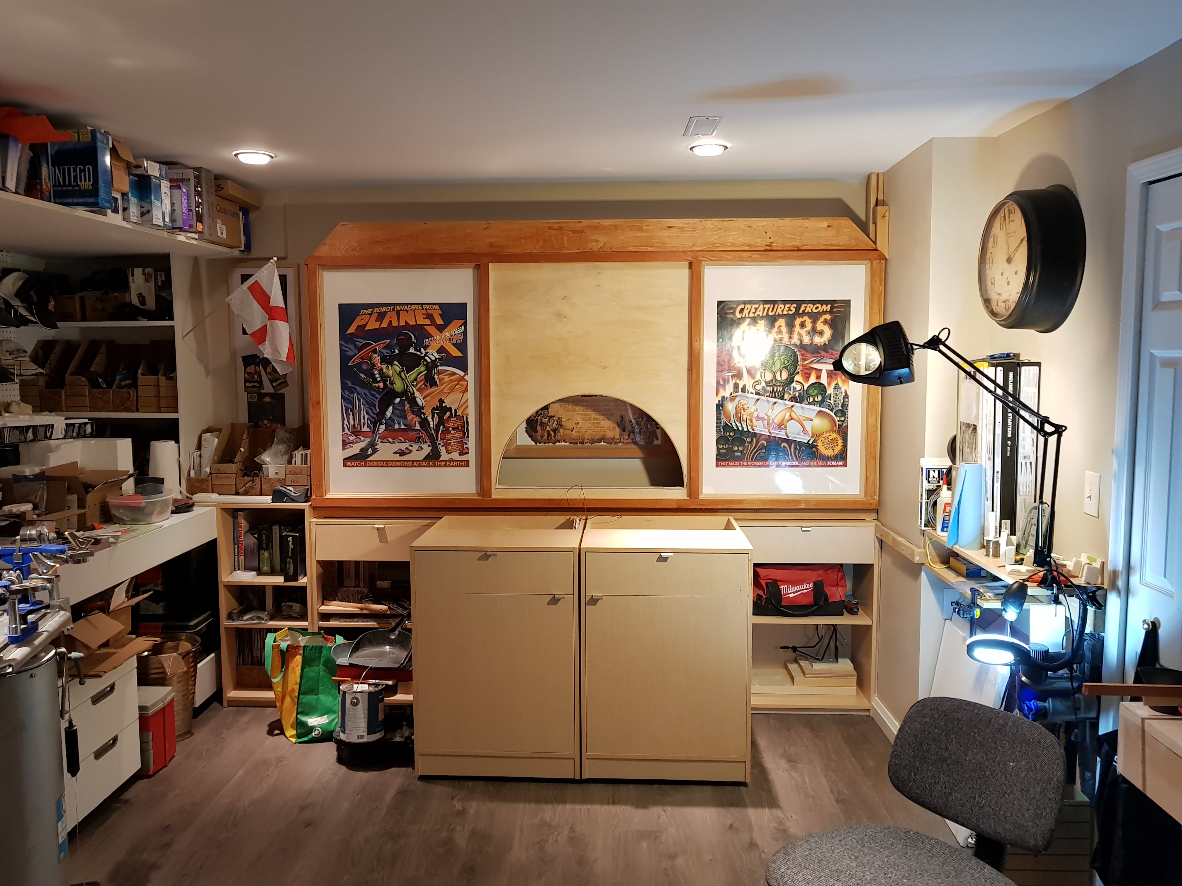 Trainset’s in the upright position. It folds down to rest on top of the two cabinets in the middle. Still a bit of clean-up to do. Back to the fun stuff soon.